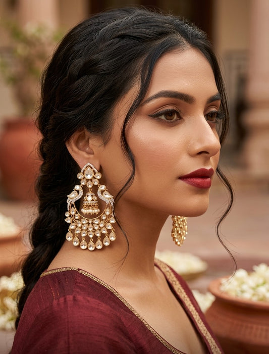 "Mayura Heritage" Handcrafted Kundan Chandbali Earrings with Jhumka Drop & Pearl Clusters