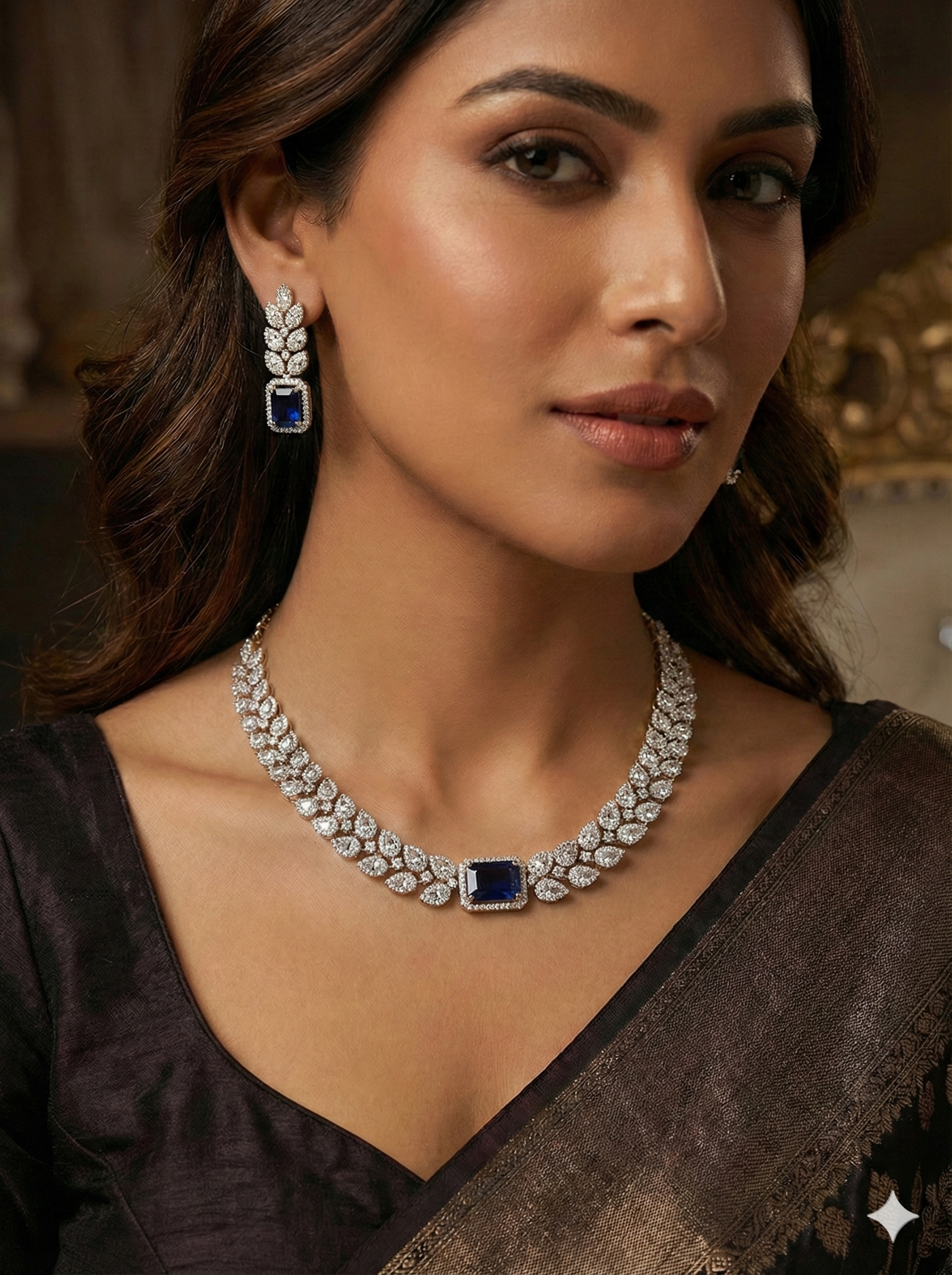 This necklace is designed to be worn close to the neck. Pair it with an off-the-shoulder gown, a boat-neck blouse, or a deep V-neck to fully showcase its elegant design and the striking blue centerpiece.