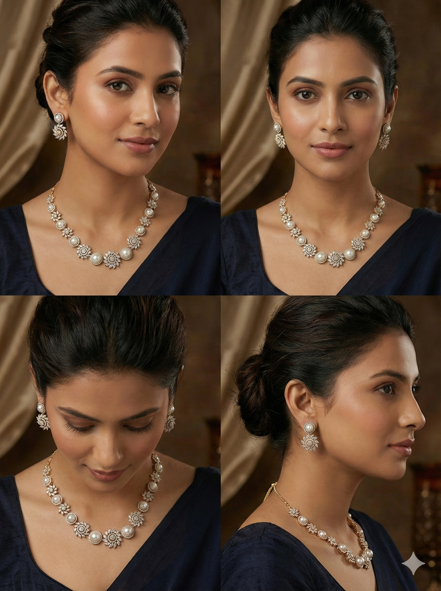 * Earrings: Matching stud earrings echo the central design of the necklace—a cluster of brilliant AD stones surrounding a single elegant faux pearl—secured with a comfortable push-back closure.