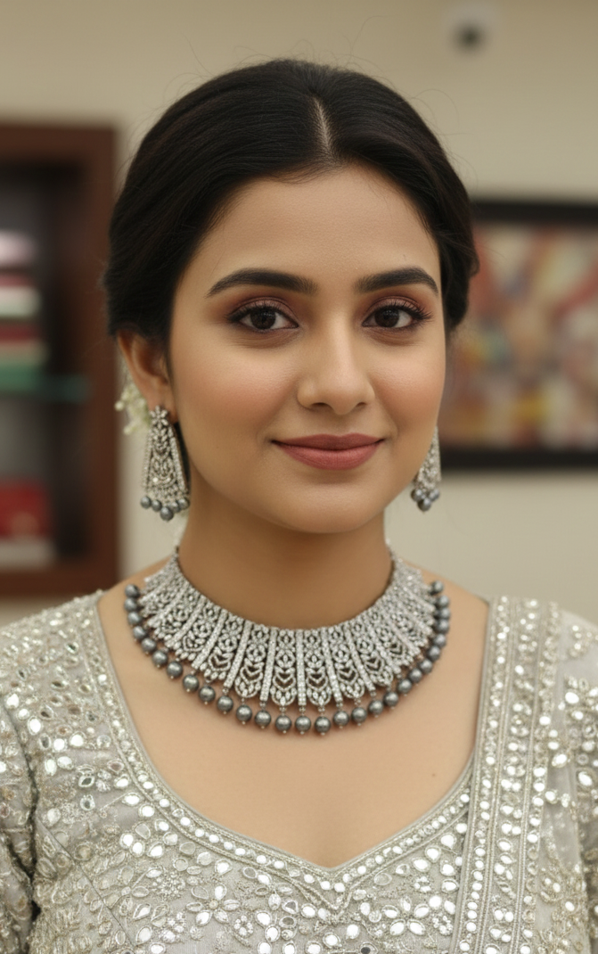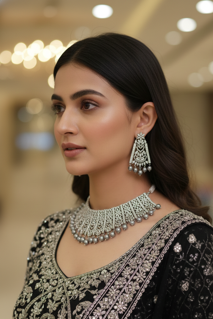 Unveil an aura of regal sophistication with this breathtaking American Diamond (AD) Necklace Set. Crafted with meticulous detail, this piece features a bold, choker-style silhouette, making it a perfect statement accessory for weddings, receptions, and grand festive occasions.