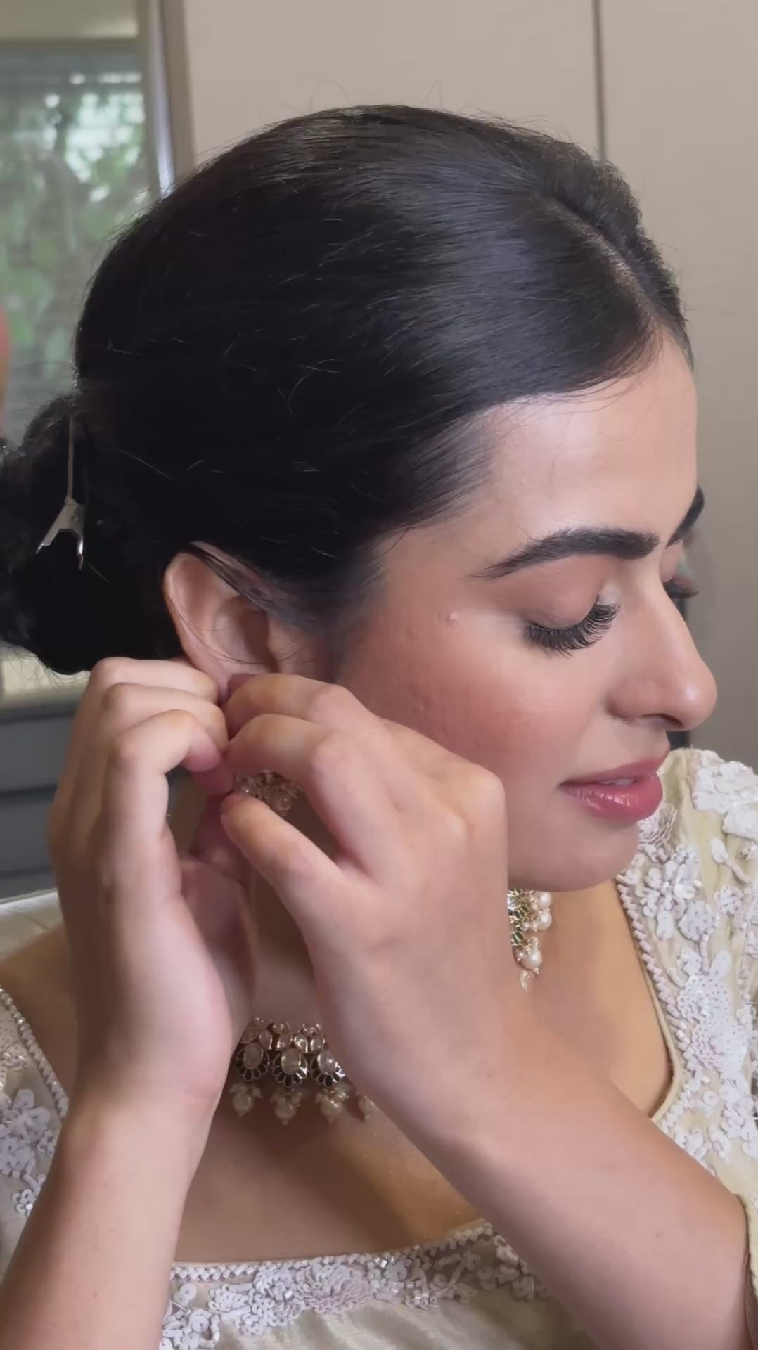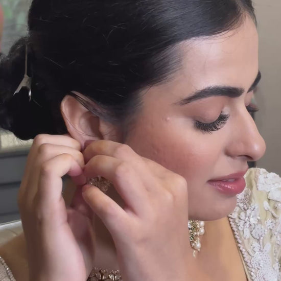 * Earrings: Matching Jhumka-style earrings featuring complementary Kundan work and pearl accents (as seen in the image).