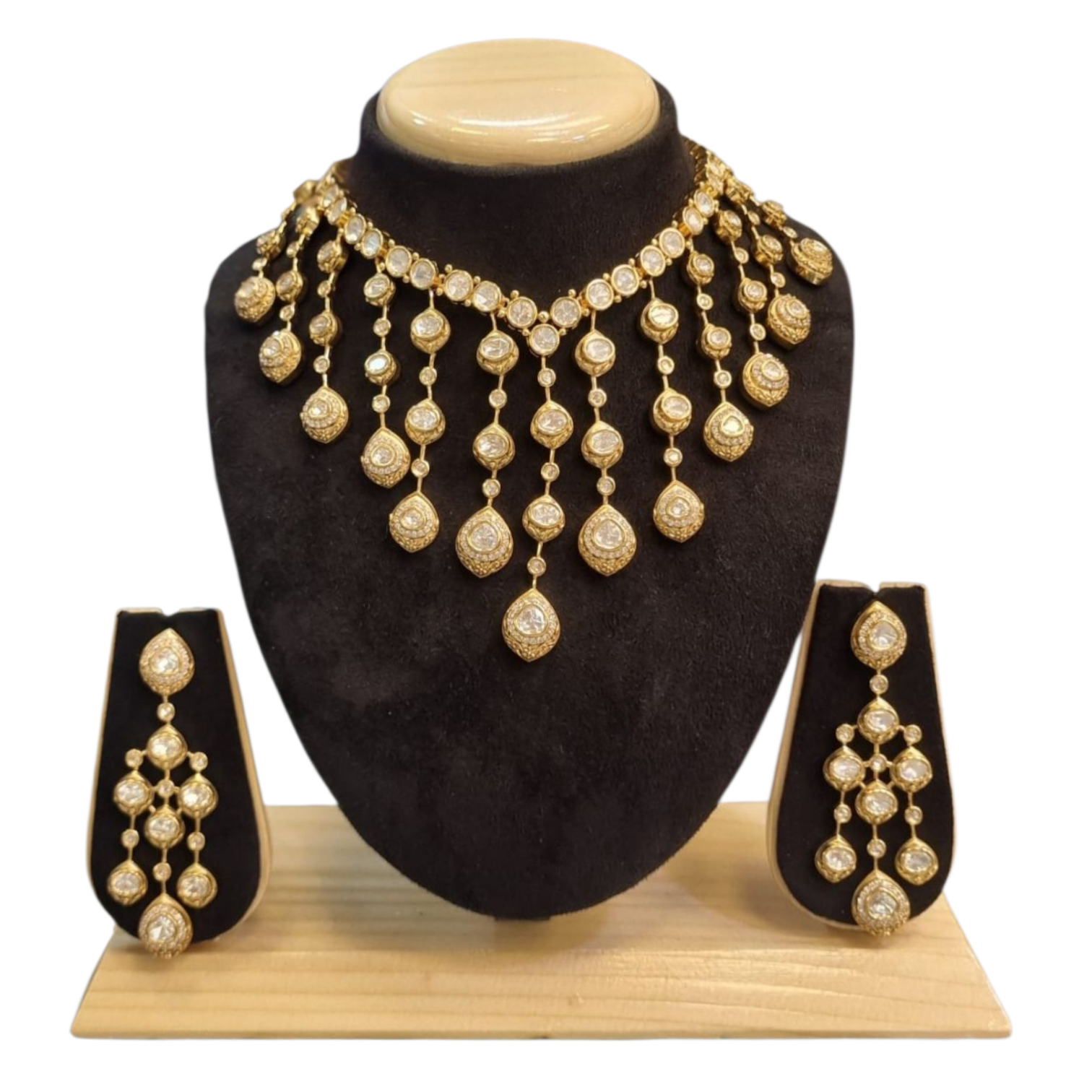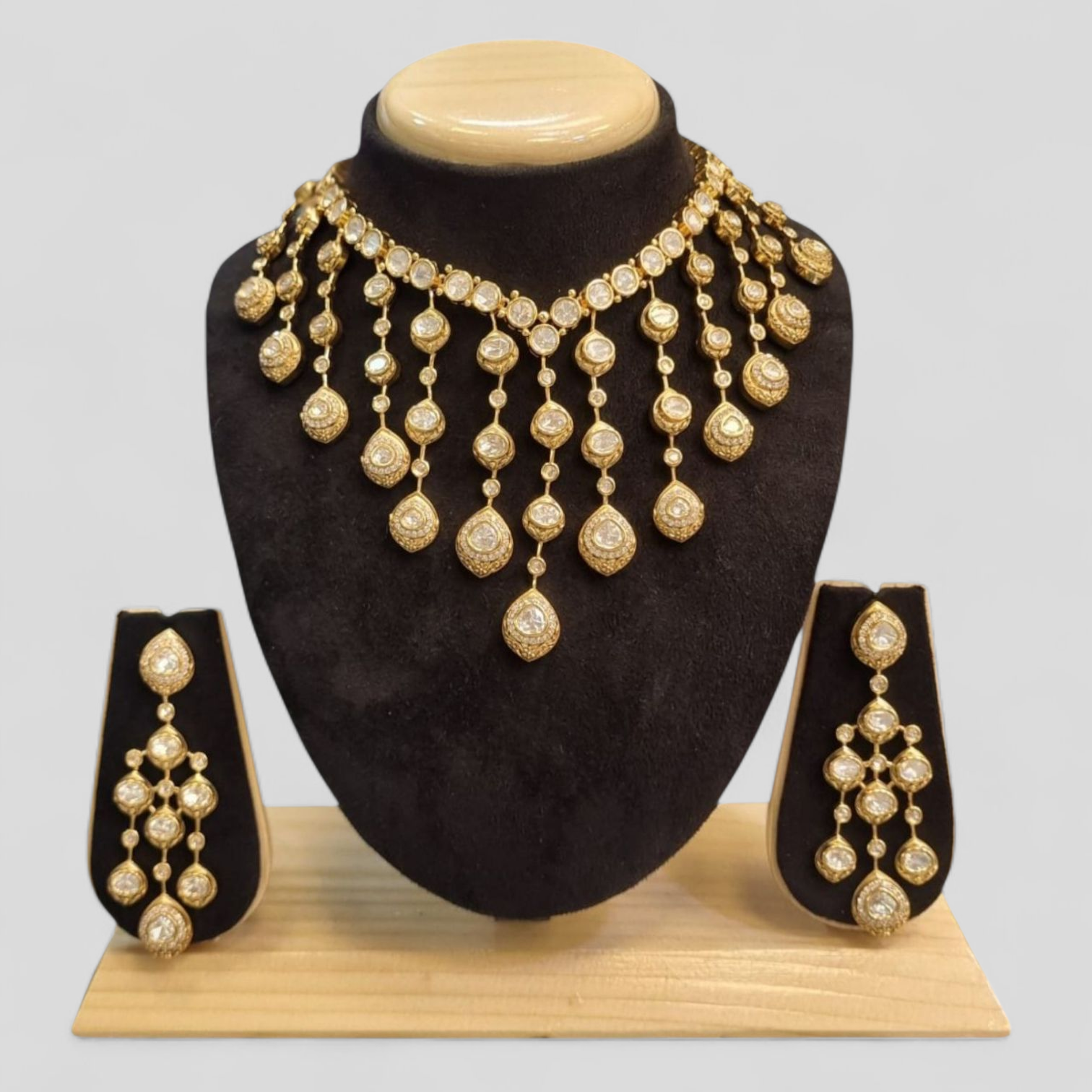 Make a dazzling statement with this exquisite traditional Kundan necklace set. The design features a stunning 'waterfall' style, with multiple strands of intricately crafted Kundan drops cascading down to create a spectacular and luxurious look. The main necklace band is adorned with a line of circular Kundan settings, from which multiple chains of different lengths descend, each ending in a beautifully detailed, teardrop-shaped Kundan motif. The entire piece is handcrafted with high-quality Kundan stones, giving it an undeniable sparkle and a rich, traditional appeal. The matching dangle earrings perfectly complement the necklace, featuring a similar cascading design with multiple Kundan drops. This set is a perfect choice for weddings, grand celebrations, and festive occasions, adding a touch of timeless glamour and sophistication to any ethnic attire.
