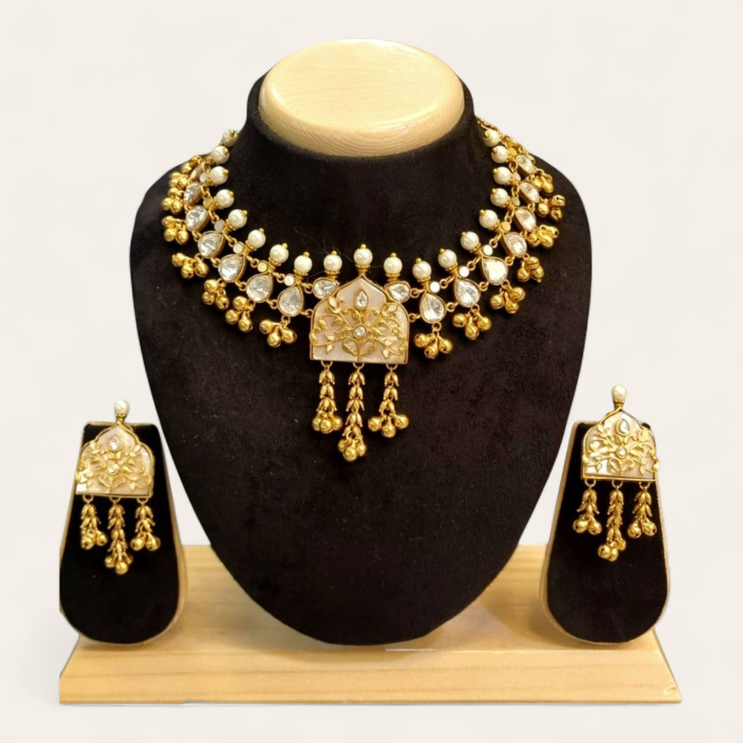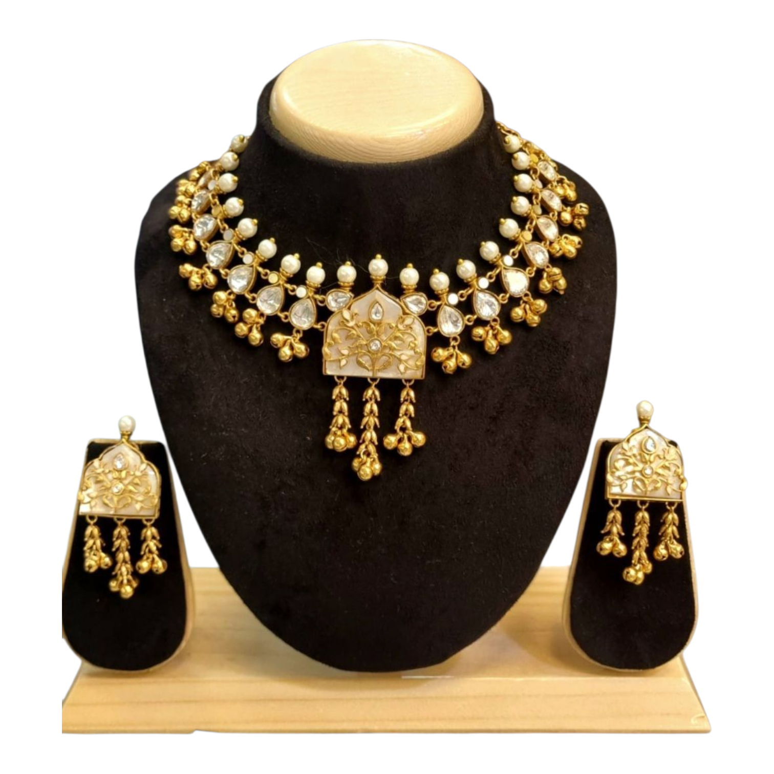 Step into a world of traditional artistry with this exquisite necklace set, a stunning blend of lustrous mother of pearl and sparkling Kundan. The centerpiece of the necklace is a beautifully crafted pendant with a detailed mother of pearl inlay, which displays a soft, iridescent sheen. The design is framed by a regal arch, from which three strands of golden beads dangle gracefully, adding movement and elegance. The necklace band is a harmonious mix of luminous pearls and brilliant Kundan stones, creating a rich and luxurious feel. The matching earrings are a perfect miniature replica of the central pendant, with the same arched design and dangling golden beads, completing the look. This set is a testament to traditional craftsmanship, perfect for adding a touch of classic charm to your ethnic attire for weddings, festivals, and special celebrations. The combination of intricate design and high-quality materials ensures you will shine on any occasion.