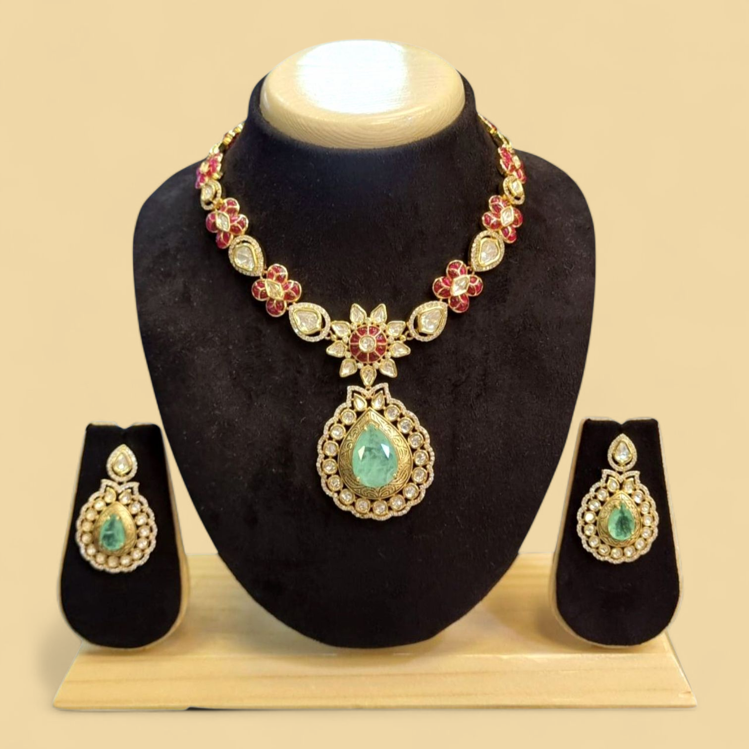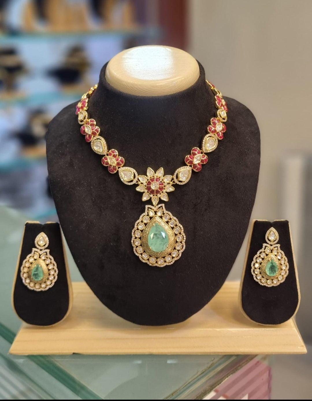 The necklace is meticulously crafted with a combination of vibrant ruby-red and sparkling white stones, set in a beautiful floral pattern. The chain leads to a magnificent central pendant, which is the highlight of the set. The pendant is a large, tear-drop shaped emerald-green stone, exquisitely framed by a halo of brilliant white stones. The design is both classic and eye-catching, making it a statement piece for any occasion.